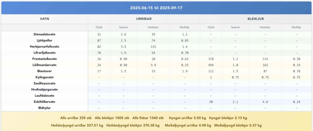 Veiðitölur fyrir sumarið 2025. Alls veiddist 1340 fiskur í vötnum sunnan Tungnaár sumarið 2025, 1005 bleikjur og 335 urriðar. Flestir fiskar veiddust í Löðmundarvatni, 494, mest smábleikja. Stærsti fiskurinn var 3,5 kg urriði úr Herbjarnarfellsvatn þar var einnig mesta meðalþyngdin (1,4 kg).